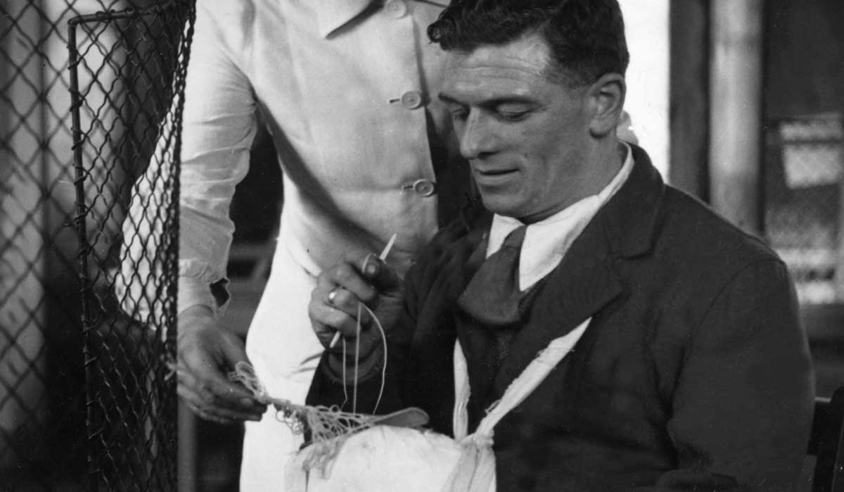 Young coal miner who had been caught in a belt, fractured humerus, ankle and elbow. PR9.